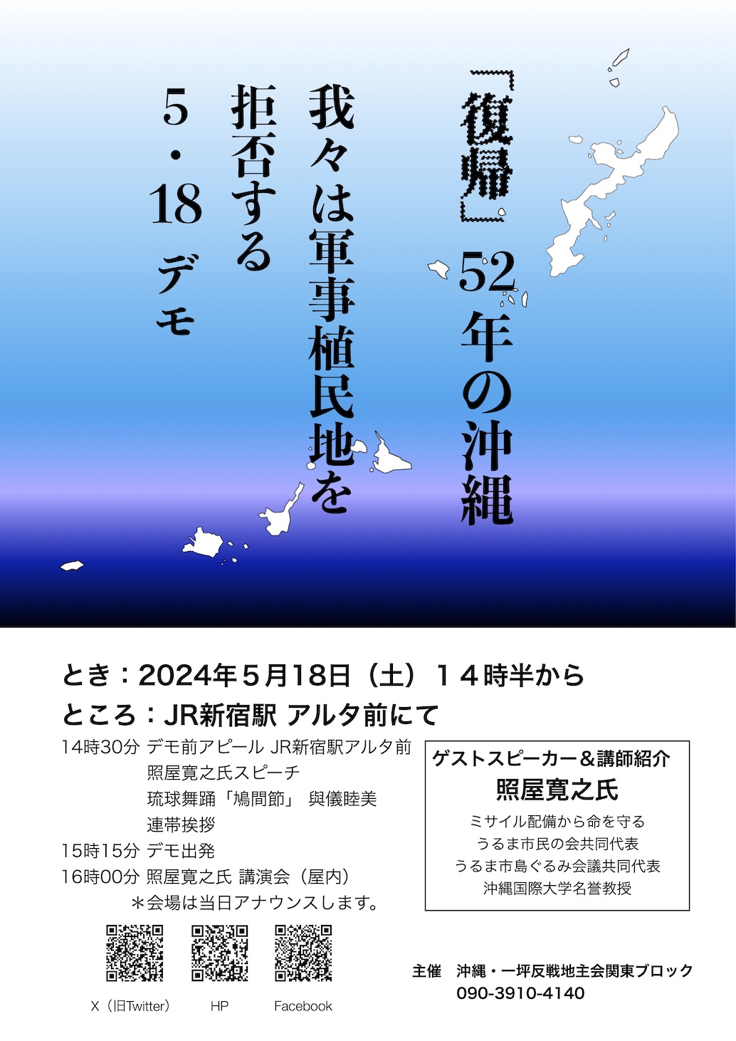 14:30 デモ前アピール JR新宿駅アルタ前/照屋寛之氏スピーチ/琉球舞踊「鳩間節」與儀睦美/連帯挨拶