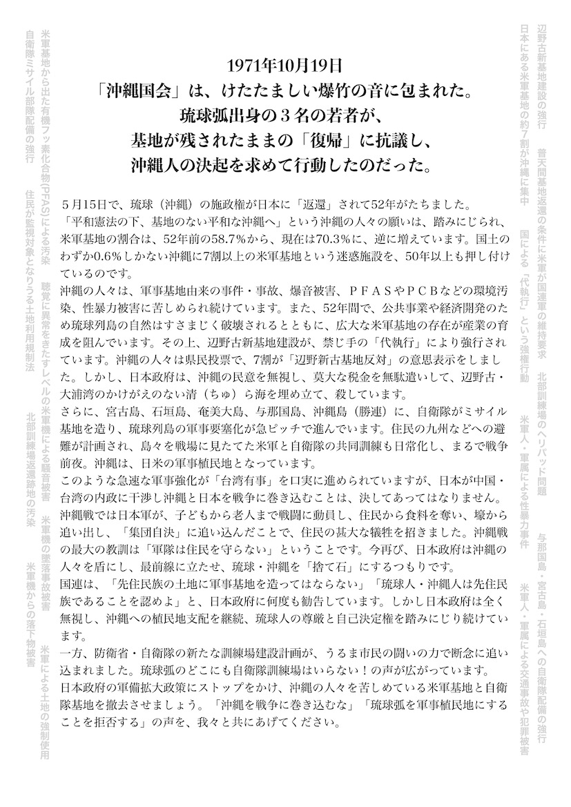 4)「復帰」52年の沖縄 我々は軍事植民地化を拒否する 5・18デモ